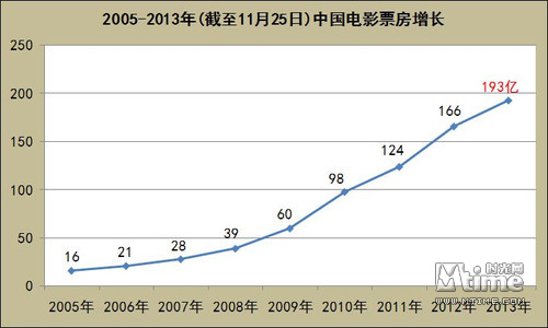 中国电影票房的增长和银幕数的增长同步,但银幕数增速更快(2013年对比)