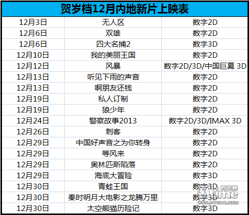 2012年12月份的单月票房为25.5亿,这其中要归功于《人再囧途之泰囧》和《十二生肖》的双核驱动,去年12月下旬几乎保持了平均每天全国9000万的票房产出。目前每天工作日的全国票房产出基本还是保持在4000~6000万左右,接下来贺岁热门影片还有刘德华主演《风暴》、冯小刚执导《私人订制》、成龙主演《警察故事2013》等作品,这些影片能否给贺岁档带来真正的票房爆发,成为最大的悬念。