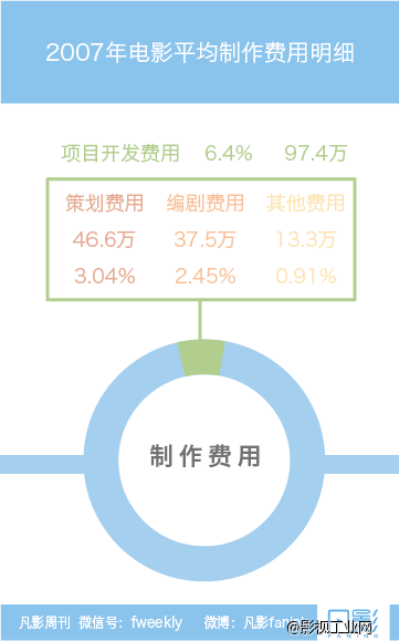 据2010年韩国电影振兴委员会(KOFIC,以下简称振兴委)发表的《韩国电影项目开发潜在力强化方案研究》显示,2007年全年电影平均制作费用为25亿韩元(约1500万人民币),平均项目开发费用为1.6亿韩元(约97.4万人民币),为制作费用的6.4%。