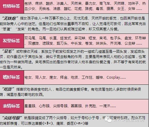 二次元审美关于“萌属性(令人激动的角色特质)”、“萌用语”的总计60多个类别的大约1000个标签,是对二次元角色全方位扫描后的特征概括,也是孩子们在异世界中思考人生、思考世界、互相交流的工具,是一种十分独特的审美体验。你会问异世界里有什么标志性的东西?二次元的审美究竟是什么样的?异世界中的人物都带有“萌属性”,所谓“萌属性”是能增加角色萌度的各种特征。我好好看了一下,也学习了一下,我觉得很牛!简单讲就是“萌属性”有60多个种类的标签,是孩子们从ACG里面总结出来的。孩子们对人的性格的归类是跟传统归类不一样的,当然受到了ACG文化形象的影响。他们会带着这样的概念看人,会在现实生活当中根据这些概念来塑造自我,这是很有意思的。下面是我罗列的部分“萌属性”: